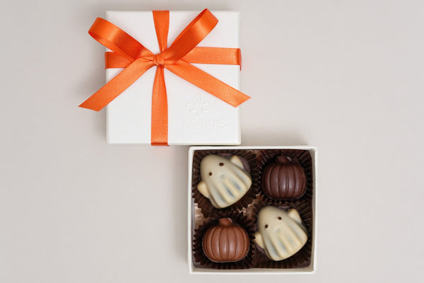 秋限定の「パンプキンチョコレート」とともに、華やかなオレンジリボンを添えて、ハロウィンを存分に楽しめるひと箱に。
