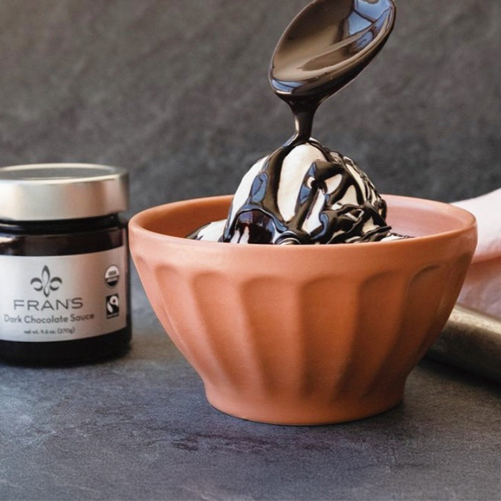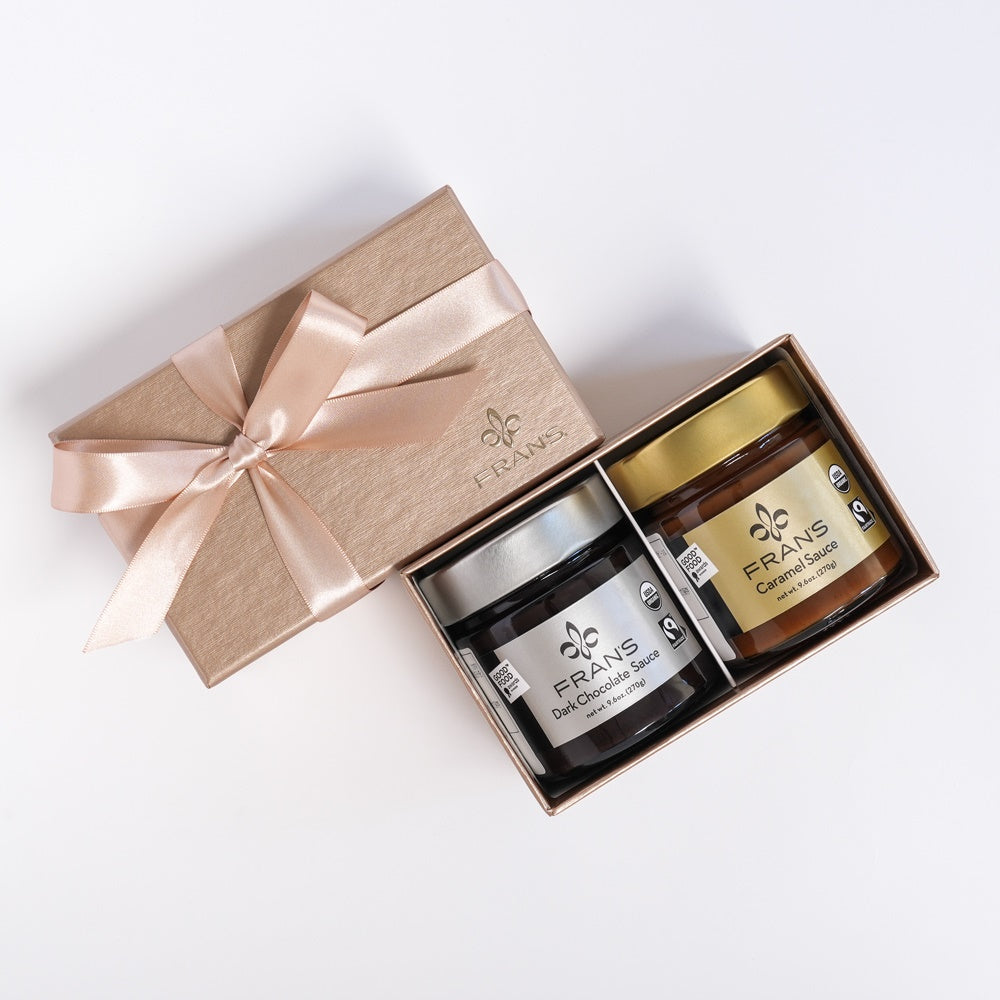 濃厚でクリーミーなダークチョコレートソースとバターが豊かに香るキャラメルソースのセットです。
