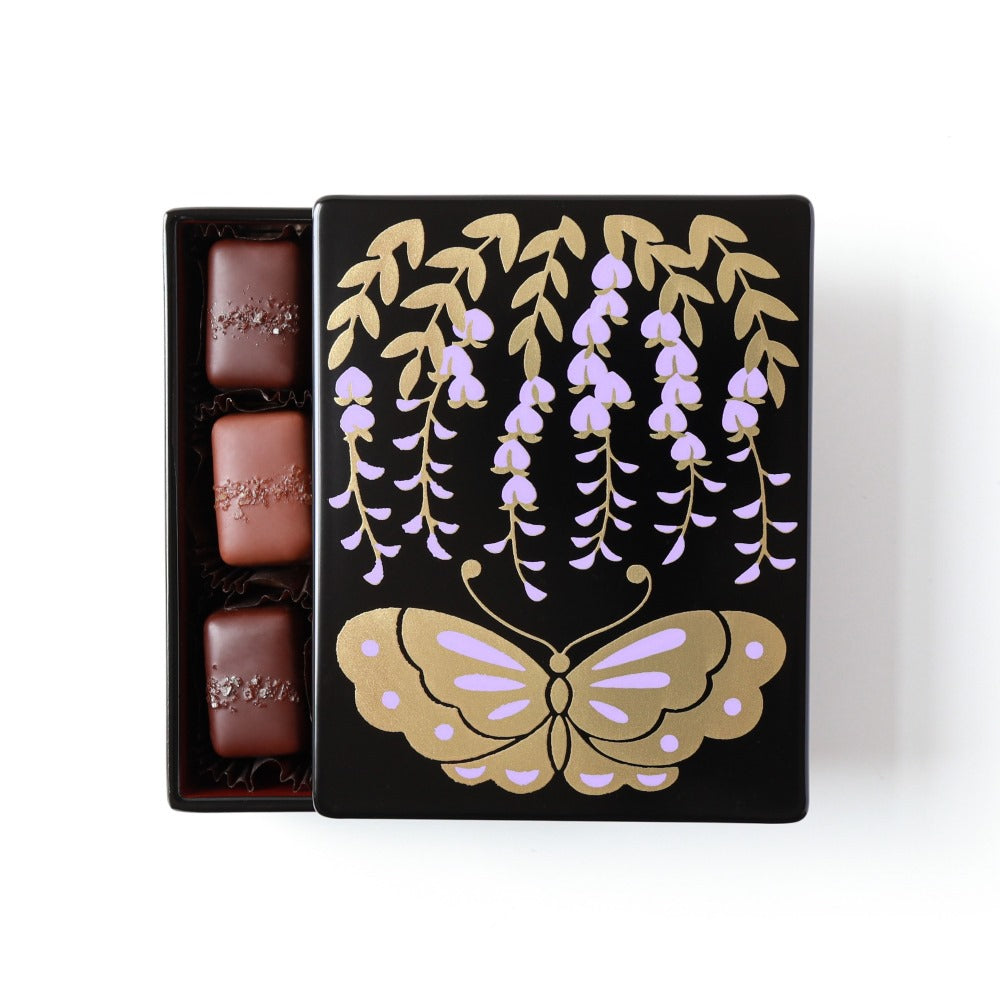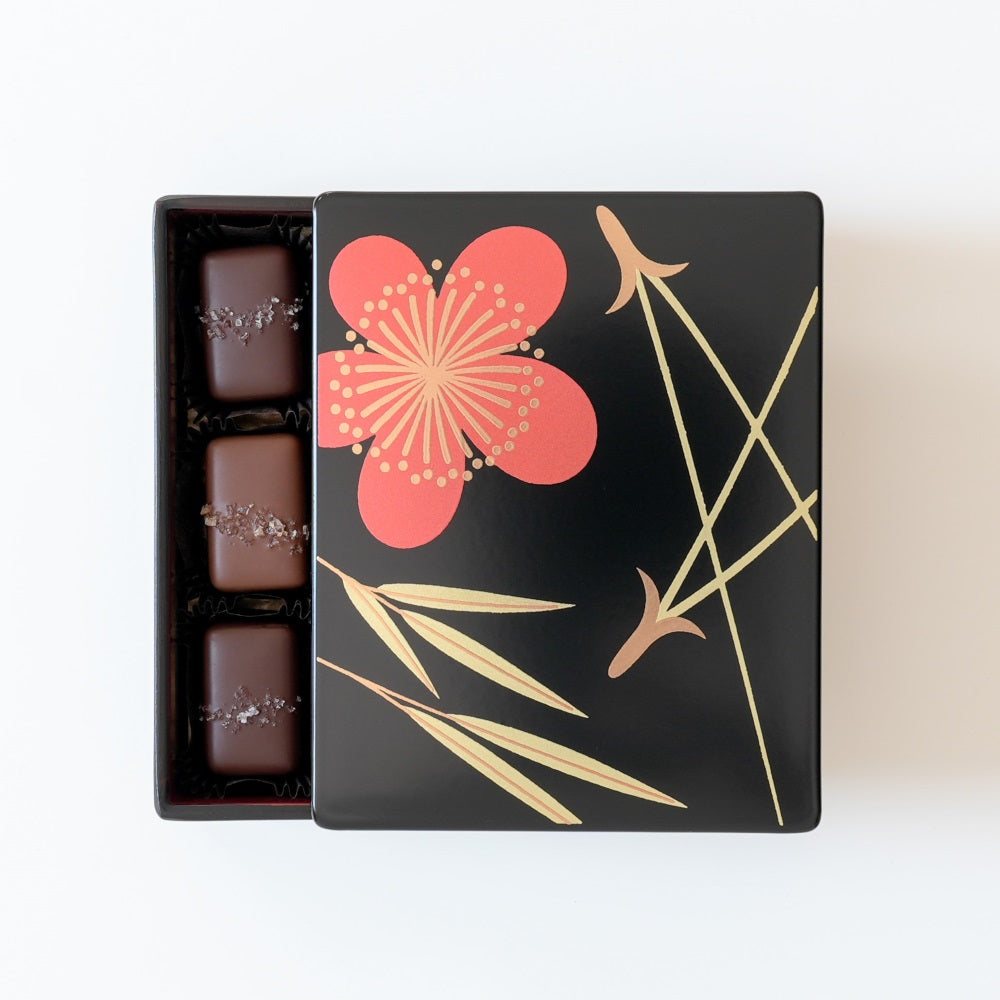 一つずつ丁寧に作られたチョコレートと漆箱は、お祝いや特別な贈り物にふさわしいひと箱です。